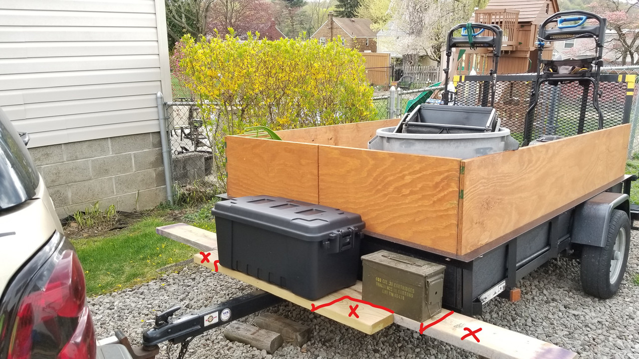 At first, I thought the lumber was overkill - extra weight I don't need - but the thickness of the board raises the box to the perfect height so that the LID is above the top frame rail of the trailer, allowing the box to be back as far as it can go AND by having the lid at the height it's at, it can be removed easily.